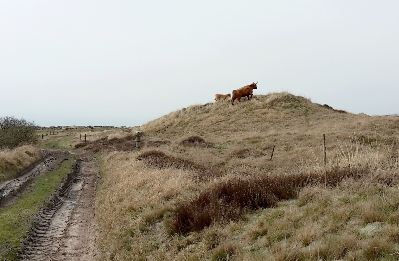 Richtung Nordby radelnd, direkt bei Tøftløs, mitten auf der bewachsenen Düne, ... eine Kuh (schottisches Hochlandrind) nebst Kalb, beide gemütlich grasend, aber außerhalb des Weidezauns. Offenkundig hatten die Zwei ein Loch im Zaun gefunden.